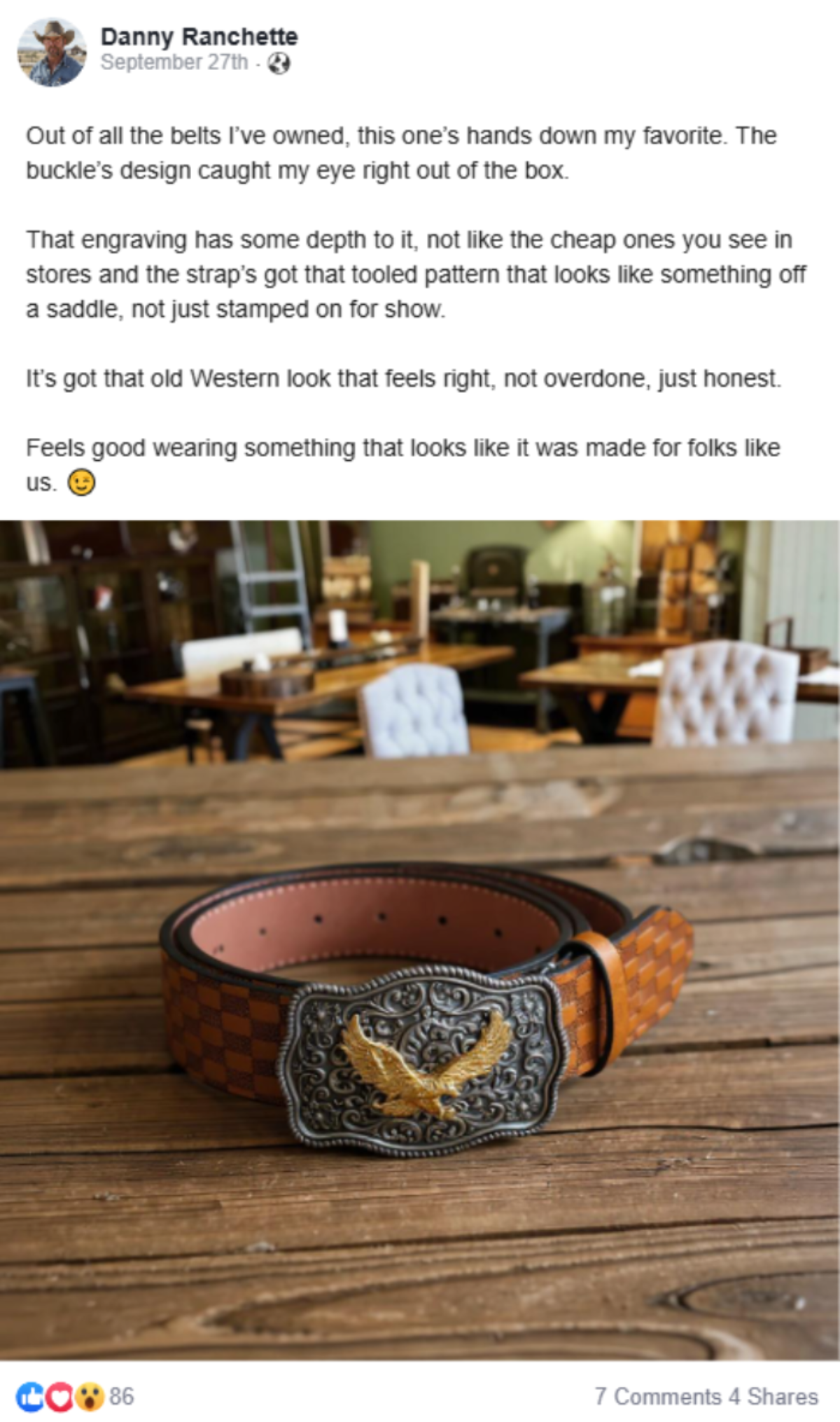 I bought this belt for nights out and it’s quickly become my favorite. The buckle is beautifully detailed and gives off an authentic Western vibe. I’ve worn it to the local bar, live shows, and even dressed it up for a wedding. It adds just the right touch without trying too hard.